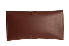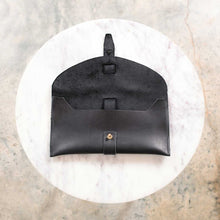 This simple envelope-style clutch holds everything together with one elegantly woven leather band and a brass post c...